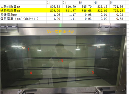 2023年浙江******產(chǎn)品檢驗(yàn)有限公司第二次采購我司一臺(tái)型號(hào)為“WHQ-900B”型的混合氣體腐蝕試驗(yàn)箱,設(shè)備在出廠之前,工作人員已經(jīng)在我內(nèi)部的實(shí)驗(yàn)室進(jìn)行過一次合格的銅片增重測試,之后設(shè)備被運(yùn)送到客戶指定的場地安裝調(diào)試運(yùn)行??蛻粼谠O(shè)備運(yùn)行了一個(gè)階段后,自行進(jìn)行一次銅片增重試驗(yàn),試驗(yàn)結(jié)束之后客戶將數(shù)據(jù)發(fā)給我司,以下是客戶和我的聊天記錄和客戶第一次做的數(shù)據(jù):